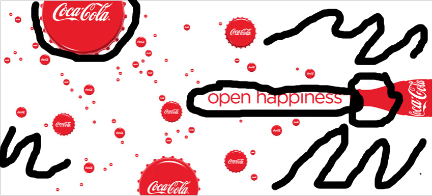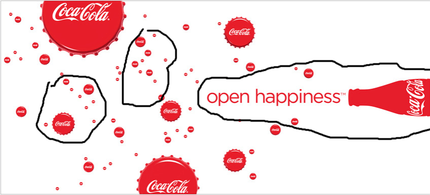 The color red is used throughout the entire piece. This helps the audience represent Coca-Cola because red is frequently used with this brand. The repetition with the brand name “Coca-Cola” is used to make sure you know what the ad is for. Lastly the use of bottle caps is used to look like bubbles which is just a creative way of doing that.