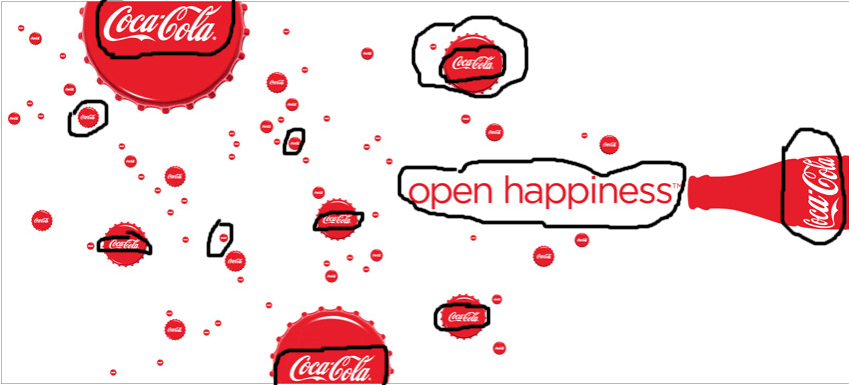 In this ad you can notice how the Coca-cola caps are different sizes to represent different sized bubbles. This helps the illusion of the caps looking like bubbles work better and be easier to recognize. The contrast of the red and white with the caps, the text, and the bottle help the image look stronger.